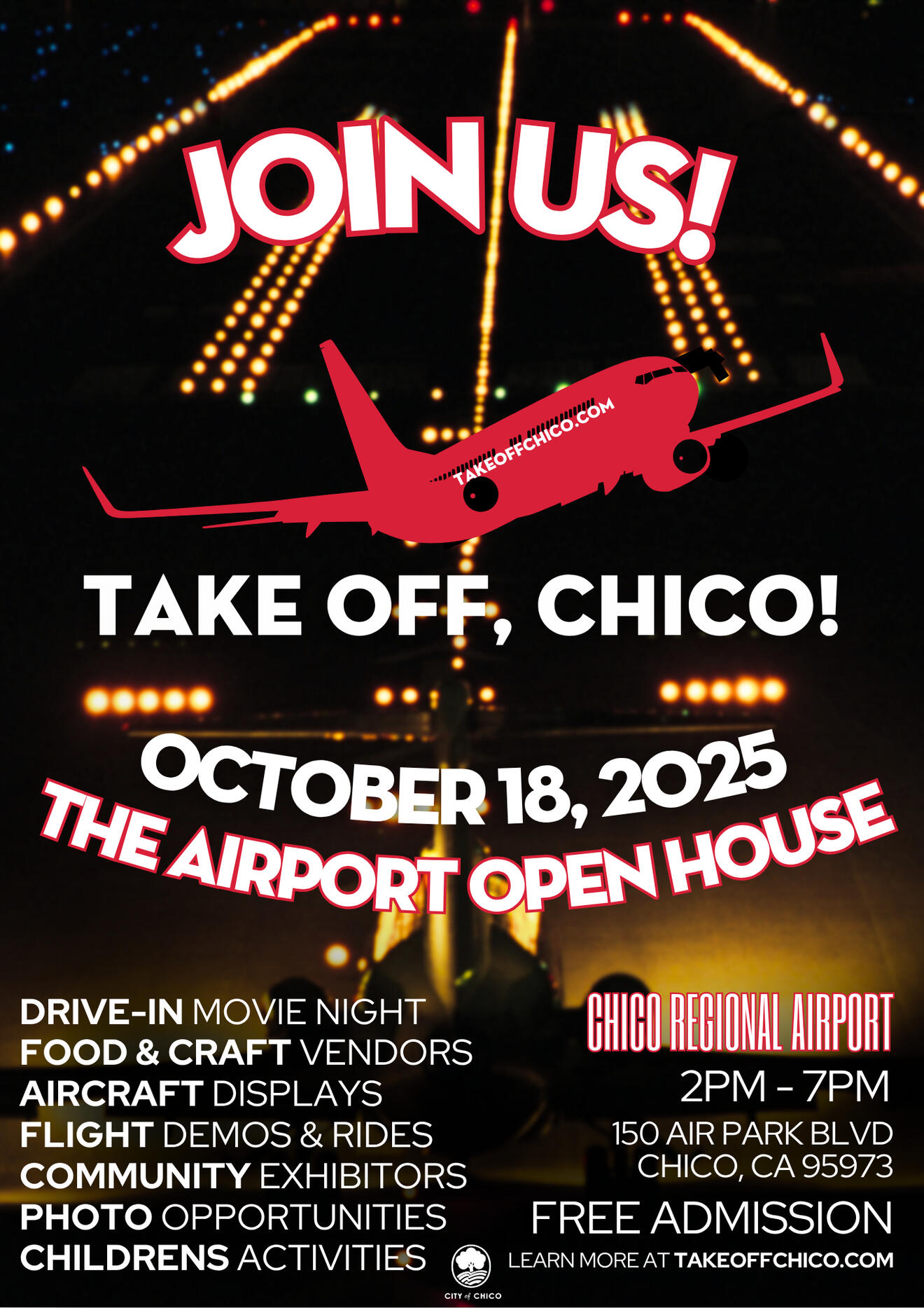 The Chico Regional Airport, in partnership with the City of Chico, invites the public to attend “Take Off, Chico!” a free public open house at the Chico Regional Airport on Oct. 18th from 2 PM - 7 PM* followed by an outdoor movie on the tarmac starting at dusk.This exciting event will offer an exclusive behind-the-scenes look at airport operations, exhibitions, aircraft displays, and more. Attendees will enjoy interactive displays, aviation history, and live demonstrations that feature exhibitors from private aviation, local businesses, and government agencies.Learn more at our Attendee Information page, or see other relevant links below.