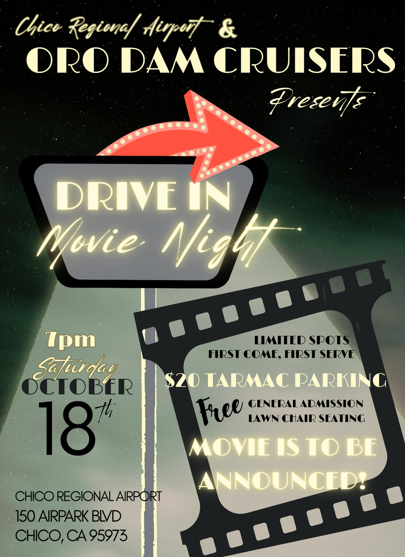 Prepare yourself for a one-of-a-kind movie experience under the night sky! We are excited to introduce the Chico Airport Drive-In Movie Night, featuring cars, planes, food, and a fun night out for the whole family!The Chico Airport Drive-In Movie Night is more than just a night at the movies. It's an opportunity to remember the nostalgia of going to a drive-in movie, meet new people, and share the love of film in an engaging and unique environment. Our movie selection for 2025 is to be announced!We look forward to welcoming you to an evening of fun, film, and camaraderie at the Chico Airport Drive-In Movie Night. Get ready for a night to remember!